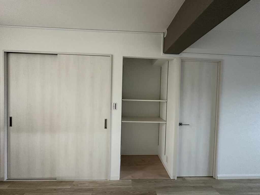 マンションにて総改修を行いました。まずリビング・和室間の壁を解体。キッチンを壁から離し、広大なLDKとスタイリッシュなアイランドキッチンを作りました。解放感が抜群のLDKになりました。また、このLDKと洋室の壁に”エコカラット”というインテリア壁材を設置し、高級感のあるおしゃれな内装に仕上げました。湿度の調整や脱臭効果があるので、とてもおすすめです。そして別の洋室では、高さ160センチほどのL型のロフトを造作。上下とも壁には同じくエコカラットを、上面には床と同じフローリングを用いて施工しました。下側は建具で開け閉めでき、使い勝手は最高です。玄関ドア周りはアクセントクロスで、さりげない分電盤も要注目です